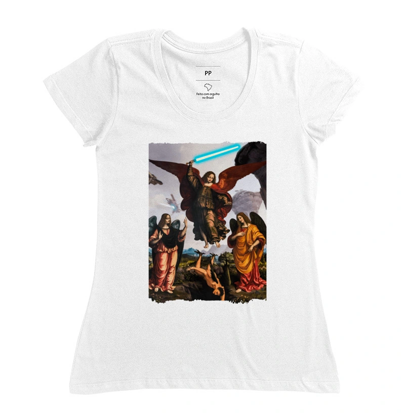 Anjos expulsando demonio com espada laser